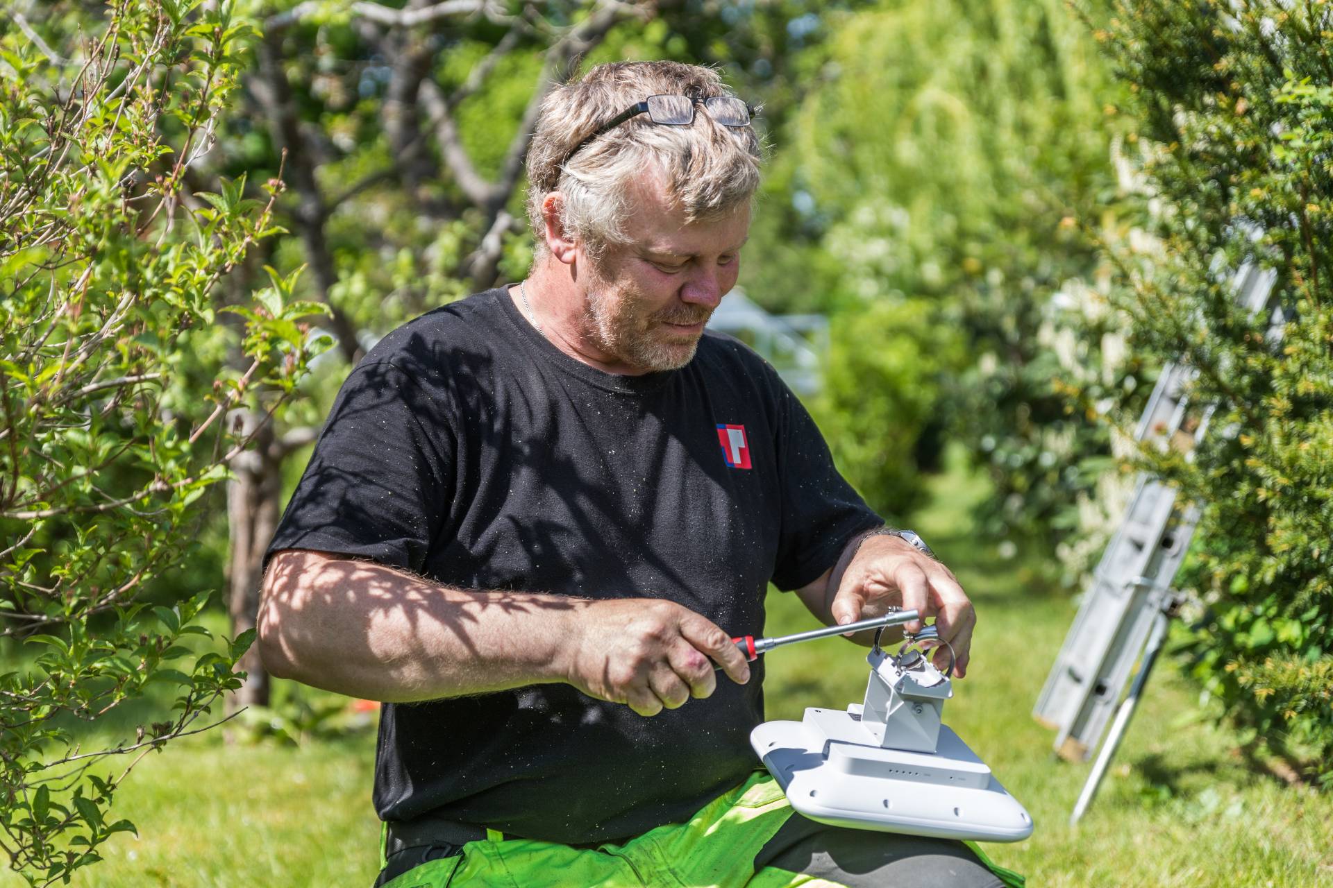 Under tiden Ola lyfter ur materialet ur bilen småpratar vi lite. Jag undrar om man kan jämföra denna typ av installation med att installera fiber? Eller skulle du kanske säga att detta är ett mycket snabbare sätt för att komma igång, ur ett kundperspektiv? Ja, absolut, det går ju inte att jämföra! En fiber ska schaktas fram i vägen utanför och grävas på tomten för att komma in till fastigheten där routern kopplas in. I de här installationerna behöver vi inte gräva och återställa mark då det går via radiovågor i luften.